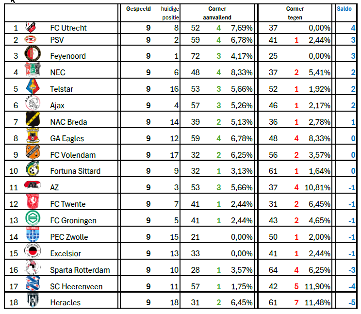 Go Ahead Eagles en AZ krijgen weliswaar relatief veel doelpunten tegen uit corners, maar ze maken zelf gelukkig ook relatief veel doelpunten uit corners. Directe concurrenten NEC en FC Utrecht maken procentueel gezien echter meer doelpunten en krijgen ruim minder tegen. Als dit zich doorzet in de rest van de competitie zou het verschil in doelsaldo tussen NEC en FC Utrecht ten opzichte van Go Ahead Eagles en AZ zomaar kunnen oplopen naar 12 tot 14 doelpunten. Zo'n groot verschil gaat invloed hebben op de eindstand!