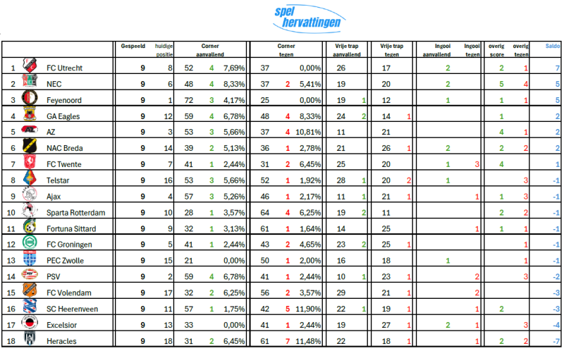 In de laatste kolom valt direct op dat FC Utrecht, NEC en Feyenoord een veel beter doelsaldo uit spelhervattingen hebben dan de rest en dat Excelsior en Heracles een mindere start hebben gehad op dit gebied.